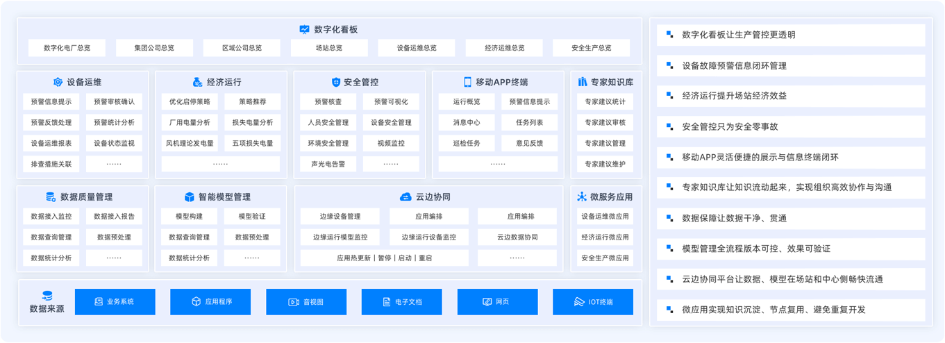 以“安全高效生產(chǎn)”為核心,以數(shù)字化為手段,穿透新能源電廠生產(chǎn)數(shù)據(jù),透視“人、機(jī)、料、法、環(huán)”與生產(chǎn)業(yè)務(wù)關(guān)系,實(shí)現(xiàn)設(shè)備高效運(yùn)維、降低運(yùn)營成本、強(qiáng)化安全風(fēng)險管控,提高企業(yè)在電力市場中的競爭力。該方案已在多家電力龍頭企業(yè)落地應(yīng)用,總計接入風(fēng)電機(jī)組4萬余臺,光伏場站500余個,總裝機(jī)容量超過150GW。