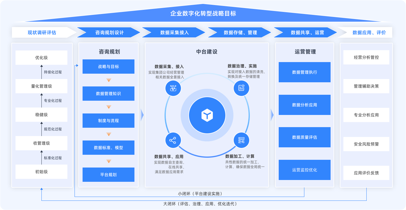 通過(guò)構(gòu)建數(shù)據(jù)治理體系與數(shù)據(jù)中臺(tái),實(shí)現(xiàn)集團(tuán)數(shù)據(jù)標(biāo)準(zhǔn)統(tǒng)一、質(zhì)量提升與跨系統(tǒng)融合,支撐業(yè)務(wù)創(chuàng)新與精準(zhǔn)決策。強(qiáng)化數(shù)據(jù)安全與合規(guī)控制,培養(yǎng)專(zhuān)業(yè)團(tuán)隊(duì),確保數(shù)據(jù)管理長(zhǎng)效良性運(yùn)轉(zhuǎn),全面提升集團(tuán)管控業(yè)務(wù)與管理職能。