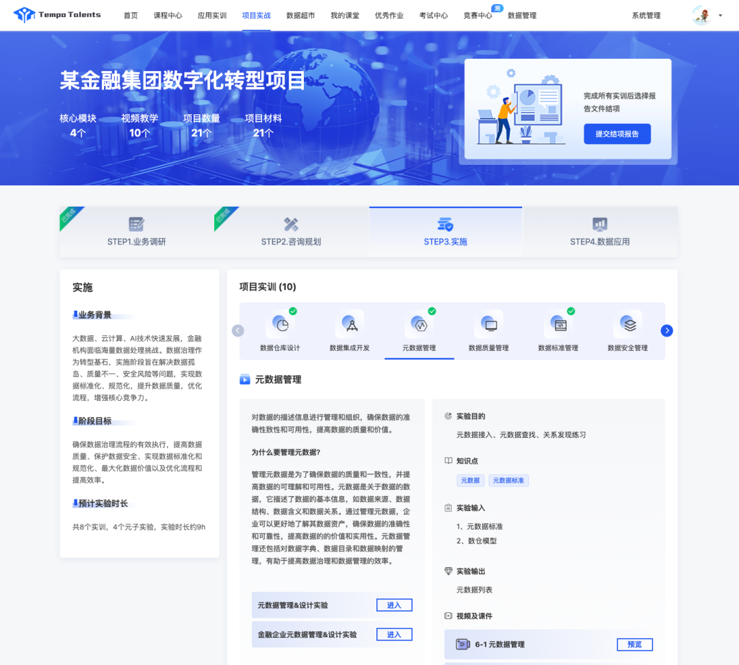 在實訓平臺中,我們創(chuàng)新性地引入了“數(shù)據(jù)治理項目應(yīng)用實戰(zhàn)”模塊,該模塊緊密依托產(chǎn)業(yè)側(cè)在數(shù)字化轉(zhuǎn)型落地過程中的真實數(shù)據(jù)治理項目,通過場景的精細拆解與高度還原,巧妙融合教學規(guī)律,從知識、技能與方法論三個維度,系統(tǒng)性地培養(yǎng)學生的數(shù)據(jù)治理綜合實戰(zhàn)能力: