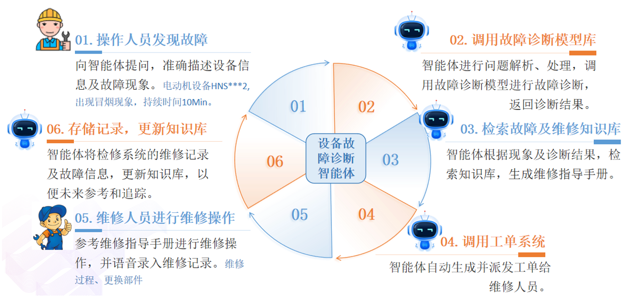 在設(shè)備故障診斷領(lǐng)域,為制造企業(yè)構(gòu)建了設(shè)備故障診斷智能體,大模型負(fù)責(zé)接收員工提出的設(shè)備故障的相關(guān)信息,并進(jìn)行理解和任務(wù)規(guī)劃,故障診斷模型庫中的小模型負(fù)責(zé)各類故障的診斷,大模型再通過診斷結(jié)果調(diào)用知識(shí)庫獲取故障處理措施然后反饋給員工。